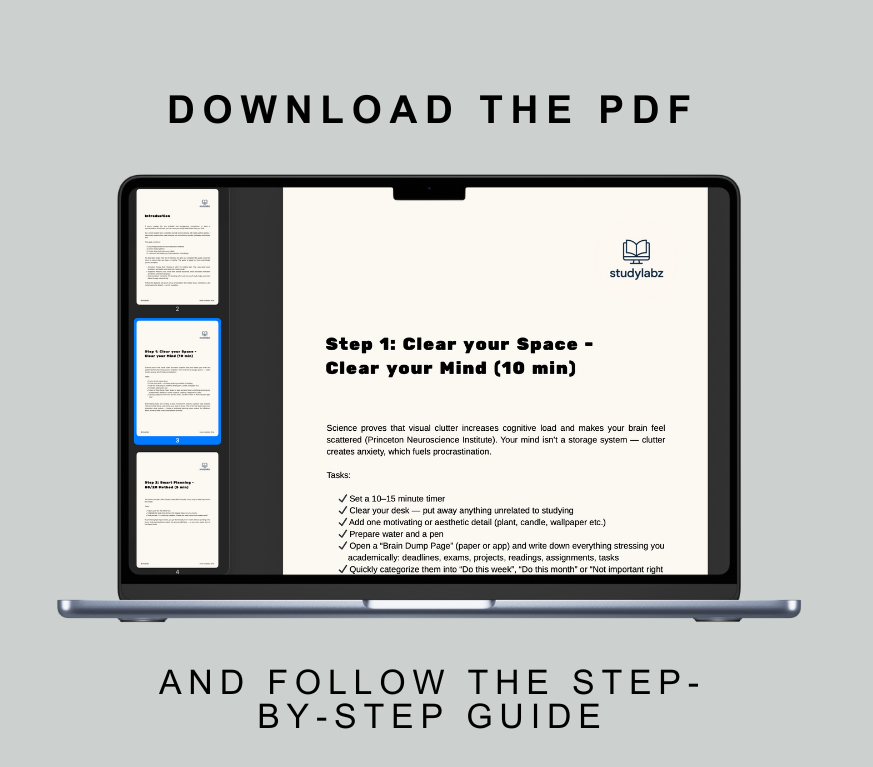 Feeling behind, unmotivated, or overwhelmed with studying? This FREE Guide for your Ultimate Study System fixes all of that. Inside, you get a simple, science-based, step-by-step process to: